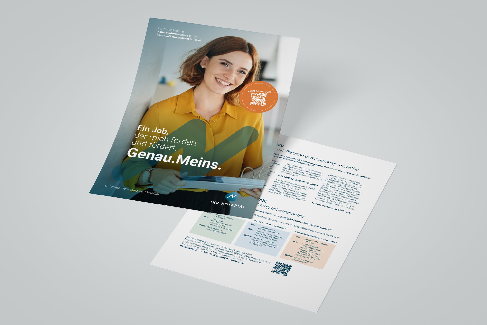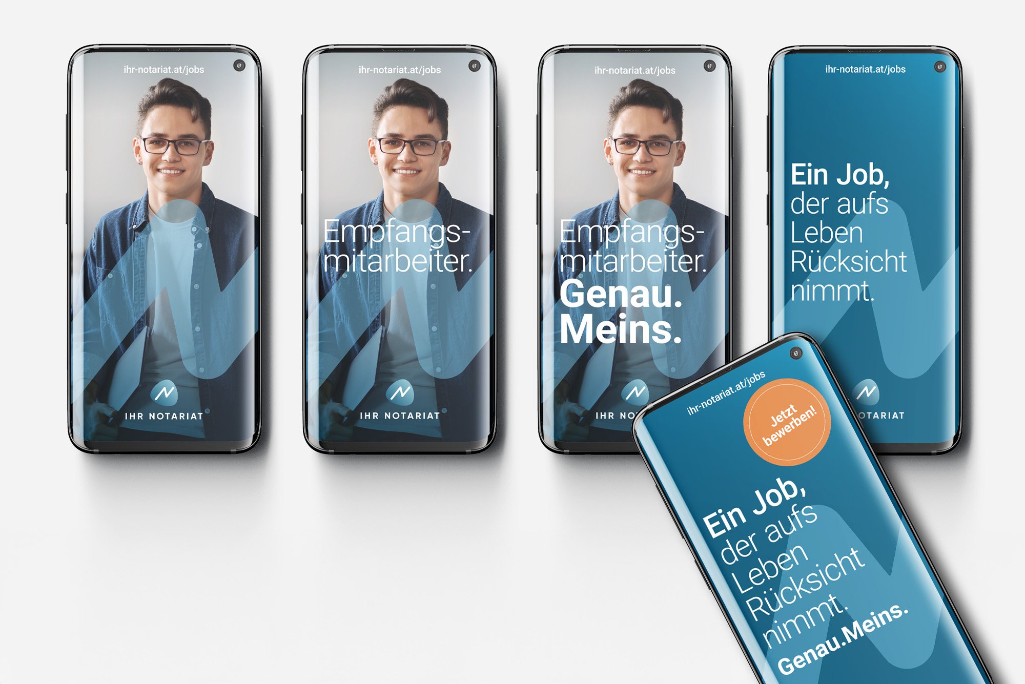 Im Zentrum der Kampagne stand die Vielseitigkeit und gesellschaftliche Relevanz notarieller Tätigkeit. Unter starken Leitbotschaften wie „Ein Job, bei dem es auf die Menschen ankommt. Genau meins!“, „Ein Job, der Sicherheit gibt und Stabilität schafft.“ sowie „Ein Job, der auf das Leben Rücksicht nimmt.“ wurde ein authentisches Bild des Notariats als moderner, zukunftssicherer Arbeitsplatz gezeichnet – relevant und sinnstiftend.