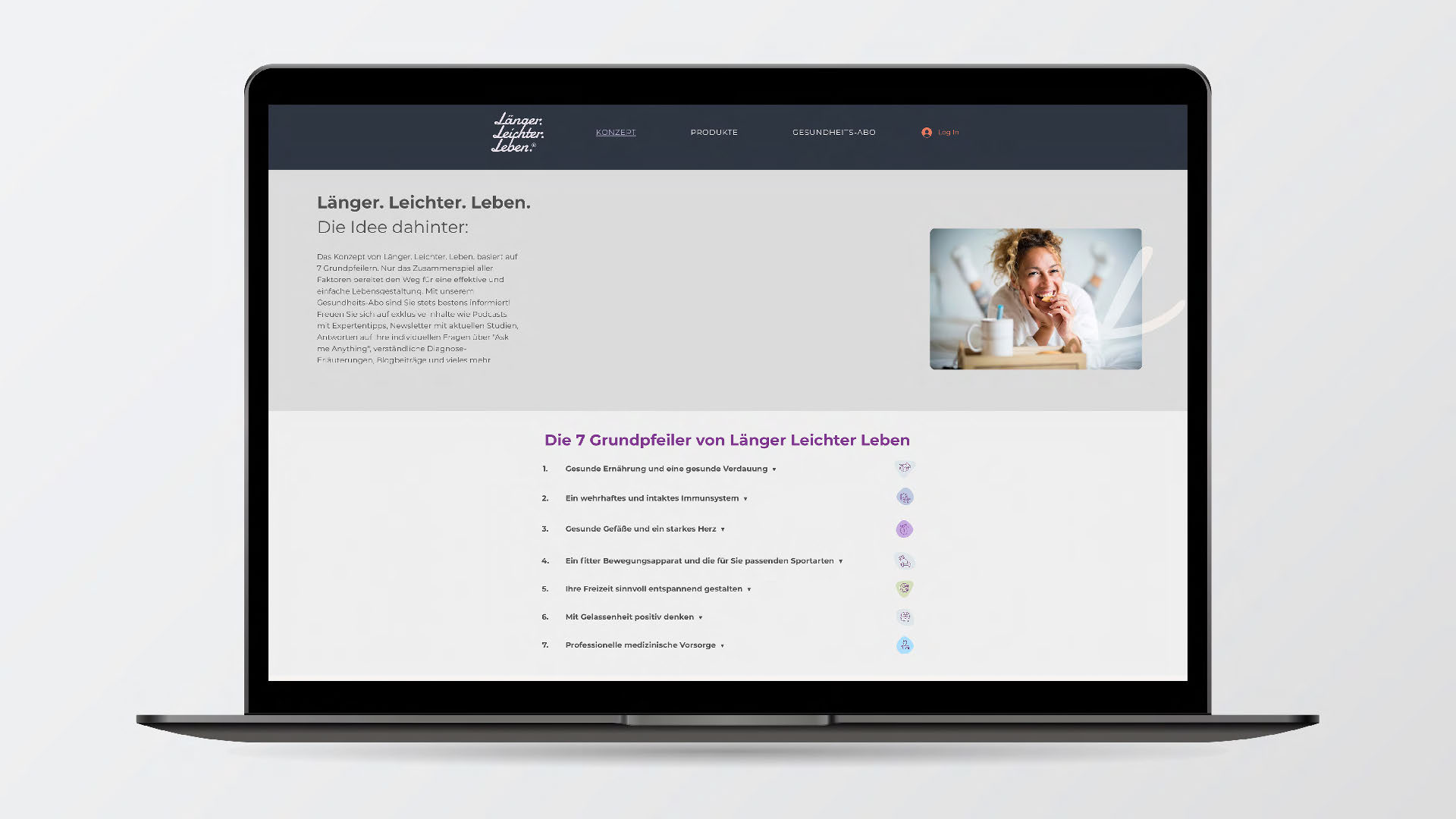 Entwicklung eines marktfähigen Gesundheitskonzepts auf Basis der inhaltlichen Grundlagen von Länger. Leichter. Leben. und Aufbau einer klar differenzierenden Markenidentität im Bereich Prävention & Lifestyle.