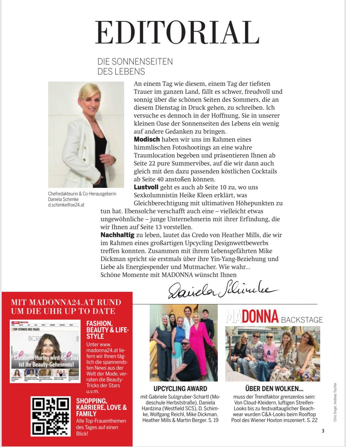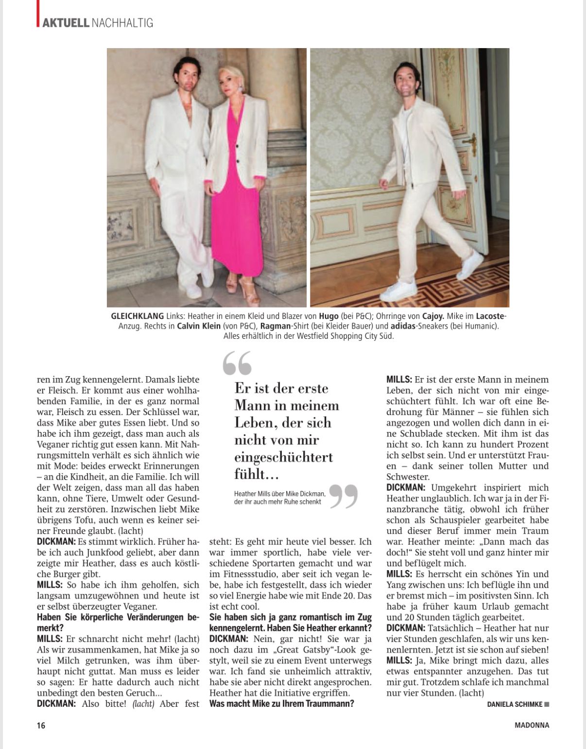 Im Rahmen dieses Awards stand Heather Mills gemeinsam mit ihrem Lebensgefährten, dem Schauspieler Mike Dickman (Barbie, Ghandi..) für ein exklusives Editorial in der Madonna vor der Kamera. Geshootet wurde im eleganten Ambiente des Wiener Luxushotels Almanac Palais.