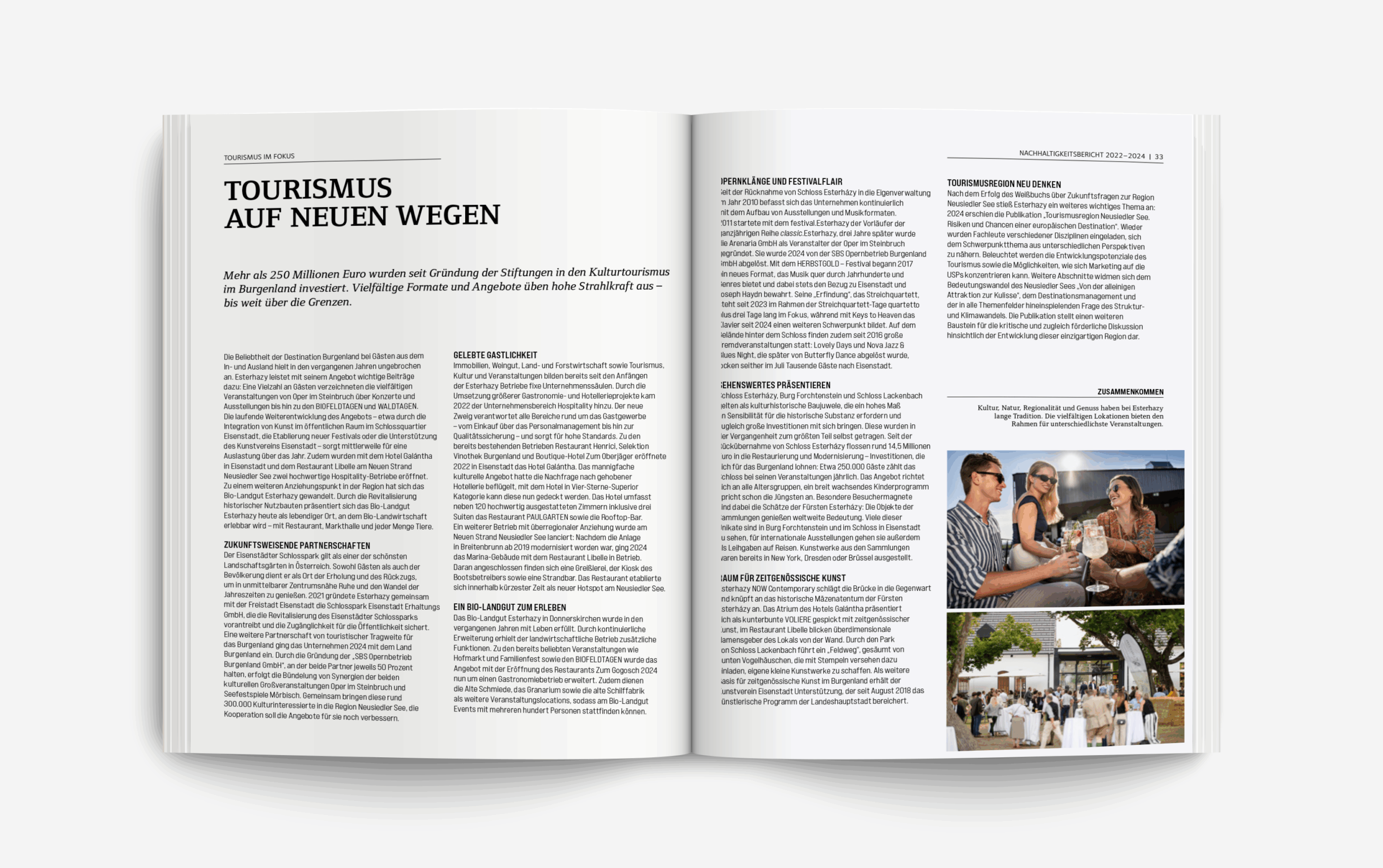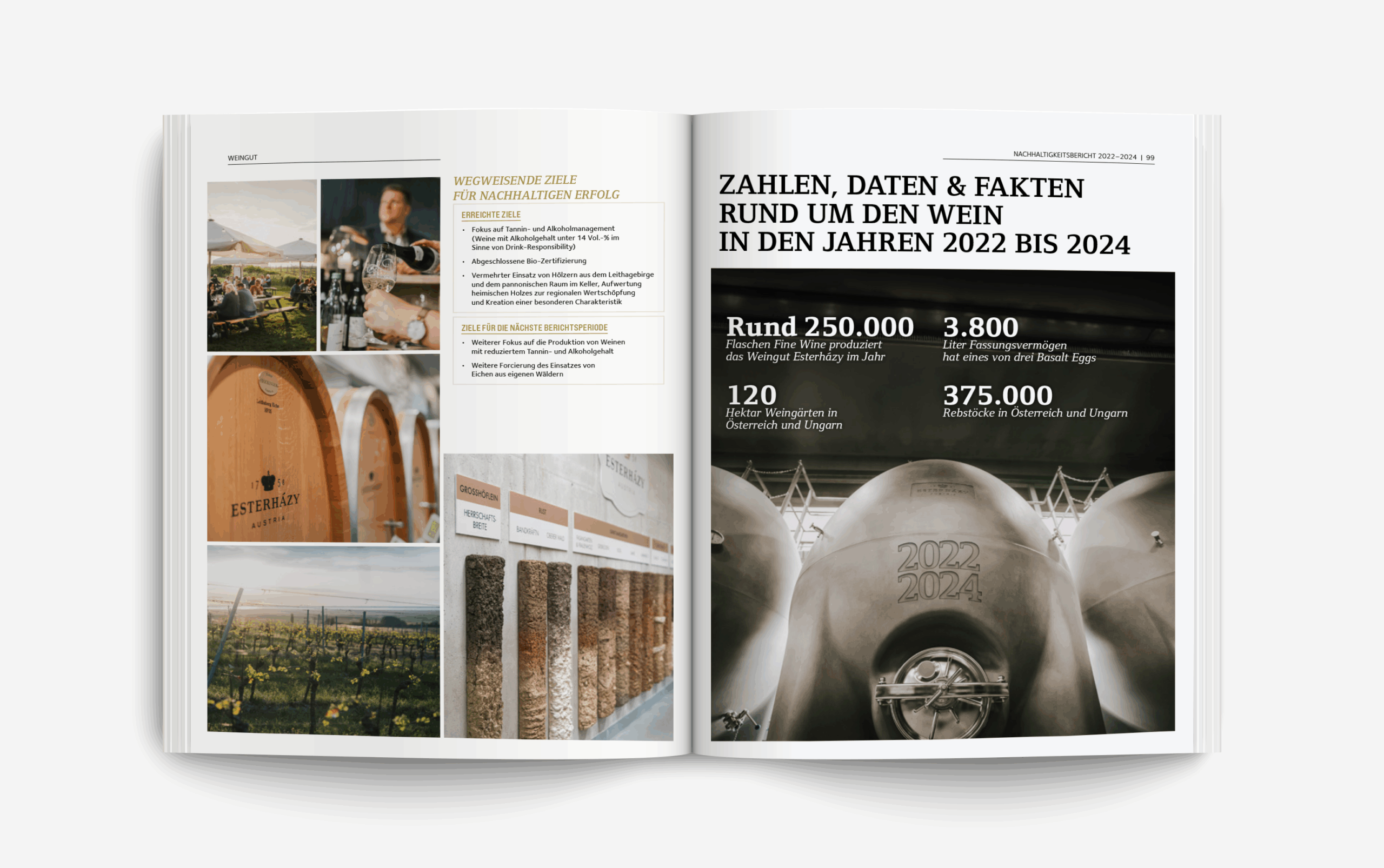 PROJEKT21 übernahm Konzeption, Layout und Grafikdesign des rund 140 Seiten umfassenden Berichts, der die fünf Unternehmensbereiche – PANNATURA, Weingut Esterházy, Hospitality, Immobilien sowie Kultur, Tourismus und Veranstaltungen – umfassend dokumentiert. Ziel war es, die vielschichtigen Inhalte nicht nur übersichtlich, sondern auch mit einem hohen gestalterischen Anspruch aufzubereiten.