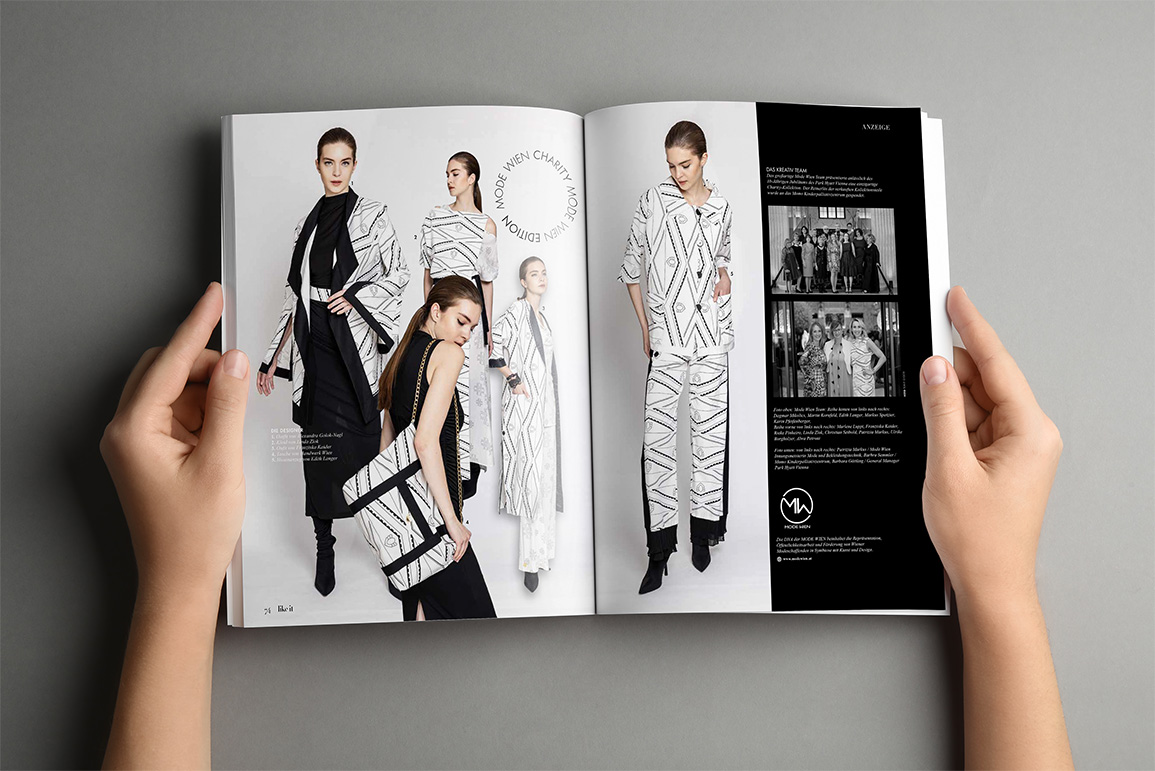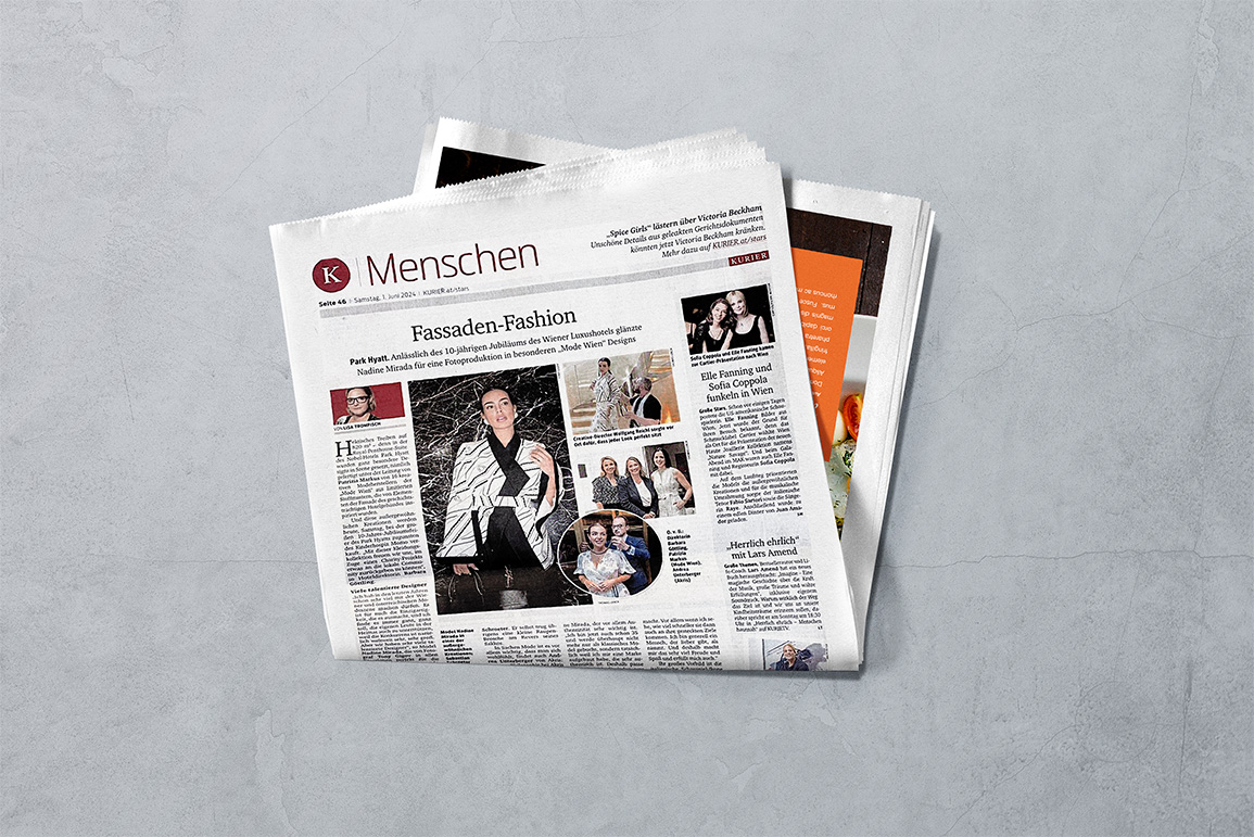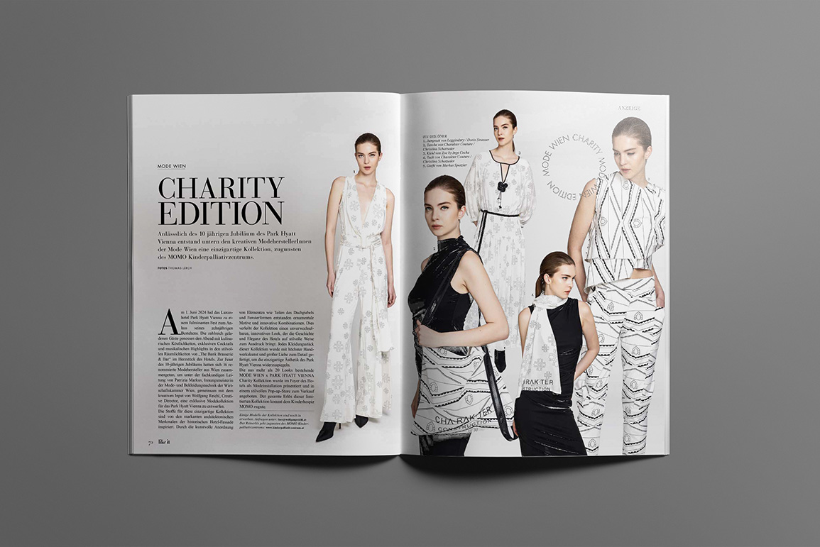 Diese bedruckten Stoffe für diese exklusive Kollektion wurden von Elementen der Fassade des geschichtsträchtigen Hotelgebäudes inspiriert und unter der Leitung von Patrizia Markus, gemeinsam mit 18 engagierten ModeherstellerInnen der MODE WIEN, zu limitierten Unikaten verarbeitet. Der gesamte Verkaufserlös dieser Kollektion geht zugunsten des Kinderhospiz Momo.