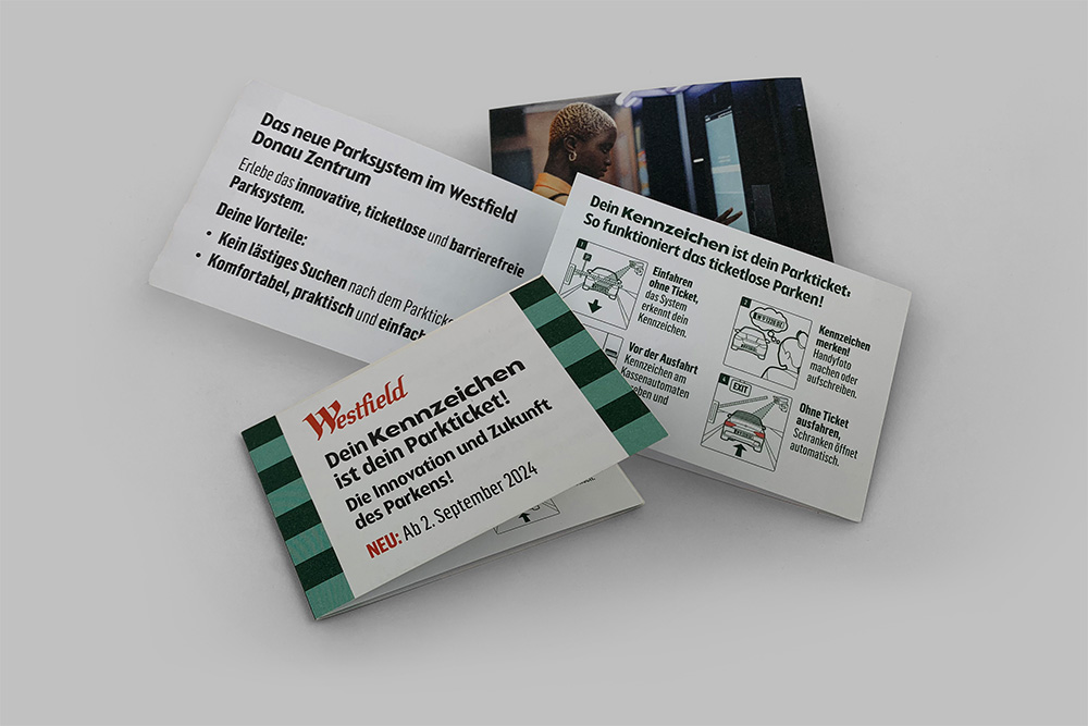 Neben einer umfassenden Promotion direkt vor Ort wurde ein komplettes Informationssystem entwickelt, um dieses neue ticketlose Parksystem optimal zu kommunizieren. Eine eigens gestaltete Animation veranschaulicht den einfachen und effizienten Ablauf des ticketlosen Parkens und erleichtert den Umstieg für alle Kund:innen.