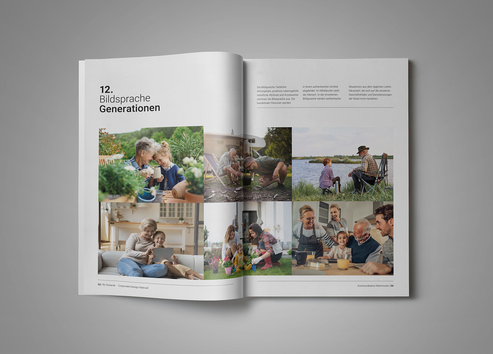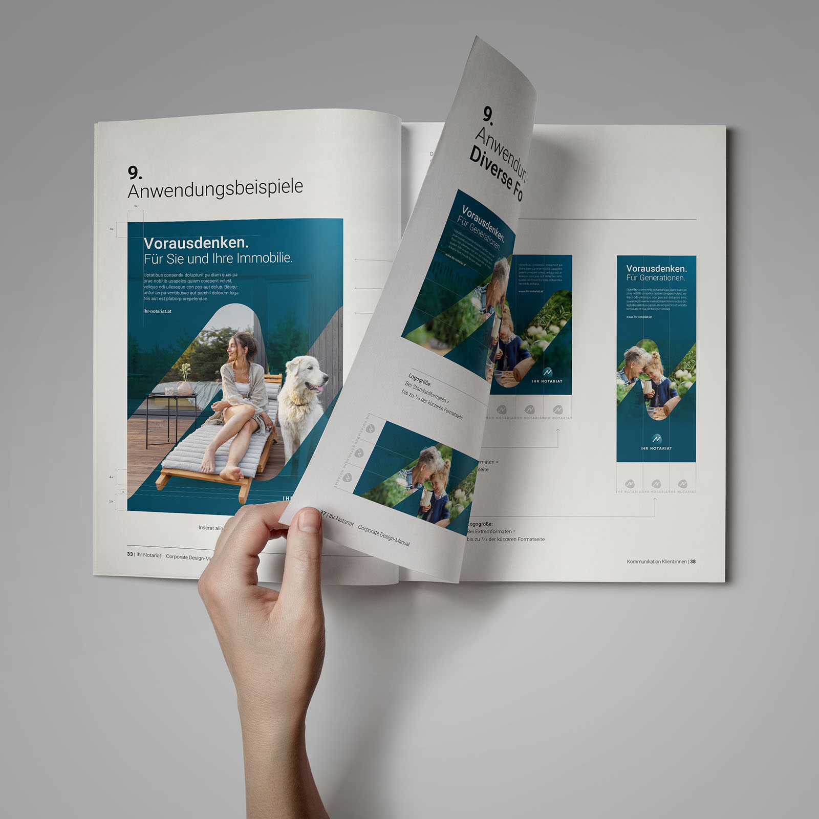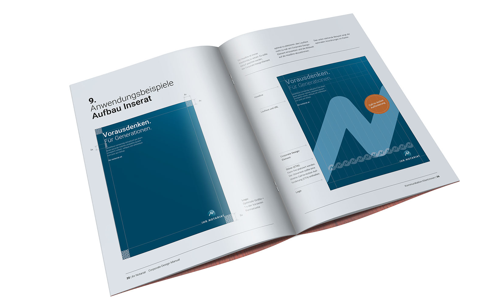Die Schärfung der Positionierung, die Emotionalisierung und der genaue Blick auf Marke und strategische Ausrichtung bildeten die Basis für den Relaunch. In einem tiefgreifenden, mehrstufigen Prozess wurden Marken-DNA und Identität geschärft, Zielgruppen analysiert und Vision und Mission abgeleitet. Danach folgte die operative und kreative Umsetzung. Das Logosignet wurde aus dem Kerngeschäft des Notariats – der vorausschauenden unparteilichen Beratung – heraus entwickelt. In der abgerundeten Form eines Triangels wird das Notariat (N) als verbindendes Glied notarieller Rechtsdienstleistungen in den Mittelpunkt gerückt. Das N hat seinen Ursprung in einer Signatur und erzeugt in Kombination mit der Wortmarke „Ihr Notariat“, die auf persönliche Klient:innenansprache setzt, Vertrauen, Sicherheit und Nähe. Um seine internen und externen Wirkungen erfüllen zu können, braucht das neue Corporate Design Kontinuität, diese und damit Wiedererkennbarkeit und höchstmögliche Awareness werden durch den konsequenten Einsatz des Corporate Design Elements N auf allen Kommunikationskanälen erzielt. Neben diesen visuellen Corporate Design Elementen wurde die Kernbotschaft des Notariats „Vorausdenken. Für Generationen.“ entwickelt. Diese Kernbotschaft ist tragender Kern notarieller Tätigkeit, ein Mehrwert für die gesamte Gesellschaft, der damit auch verbal kommuniziert wird. Um die einzelnen Geschäftsfelder des Notariats in die Kommunikation miteinzubeziehen, wurde diese Kernbotschaft abgeleitet (Vorausdenken. Für Sie und Ihre Familie. / Vorausdenken. Für Sie und Ihr Unternehmen. etc.). Damit wurden nicht nur alle Voraussetzungen für einen geschlossenen und gemeinsamen Auftritt geschaffen, sondern auch zeitlos-elegante Modernität, klar, emotional und unverspielt. Denn für die Marke ONK heißt es im Bereich der Kommunikation: Information, Service, Beratung und Menschlichkeit. Dazu gehört dieser gesamte Corporate Relaunch, der auf ein konsequent gestaltetes Gesamterscheinungsbild baut und den gesamten Auftritt der ONK nach innen und nach außen zu einer konsistenten Gestalt zusammenschließt.